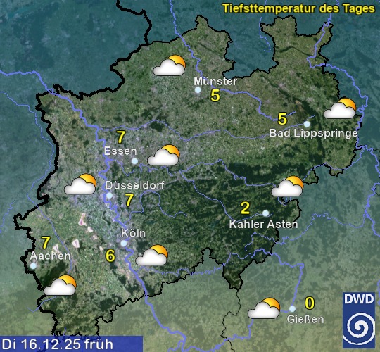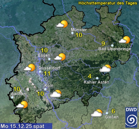Am Sonntag meist stark bewölkt oder bedeckt, etwas Sonne am Nordrand der Mittelgebirge möglich. Meist niederschlagsfrei, vereinzelt etwas Sprühregen möglich. Höchsttemperaturen zwischen 7 und 10, im Bergland 4 bis 7 Grad. Schwacher bis mäßiger Wind aus Süd. In der Nacht zum Montag vor allem im Flachland teils nur gering bewölkt oder klar, im Bergland zumeist stark bewölkt bis bedeckt und teils trüb. Örtlich Nebel. Niederschlagsfrei. Tiefstwerte 6 bis 3, in höheren Lagen bis 1 Grad.